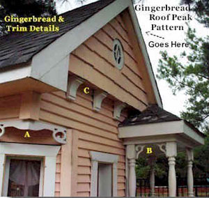 Other Trim: The oval windows are hand made with screening stapled to the inside. The corner boards for the siding are simple 1x4's nailed together in an "L" shape to cover the ends of the siding. Notice the angle cut at the top of the window trim. The support blocks below the gable overhang are hand made out of solid pine boards glued together and cut with a band saw. They are 5 " in each dimension.