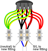 Note that the colours shown connected to the ceiling rose are the old standard - red, black and yellow and green.