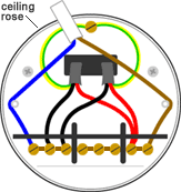 Note that the colours shown connected to the ceiling rose are the old standard - red, black and yellow and green, the modern standard being brown, blue and yellow and green (the yellow and green being the earth connector which is typically uninsulated but fitted with a yellow and green sleeving.)